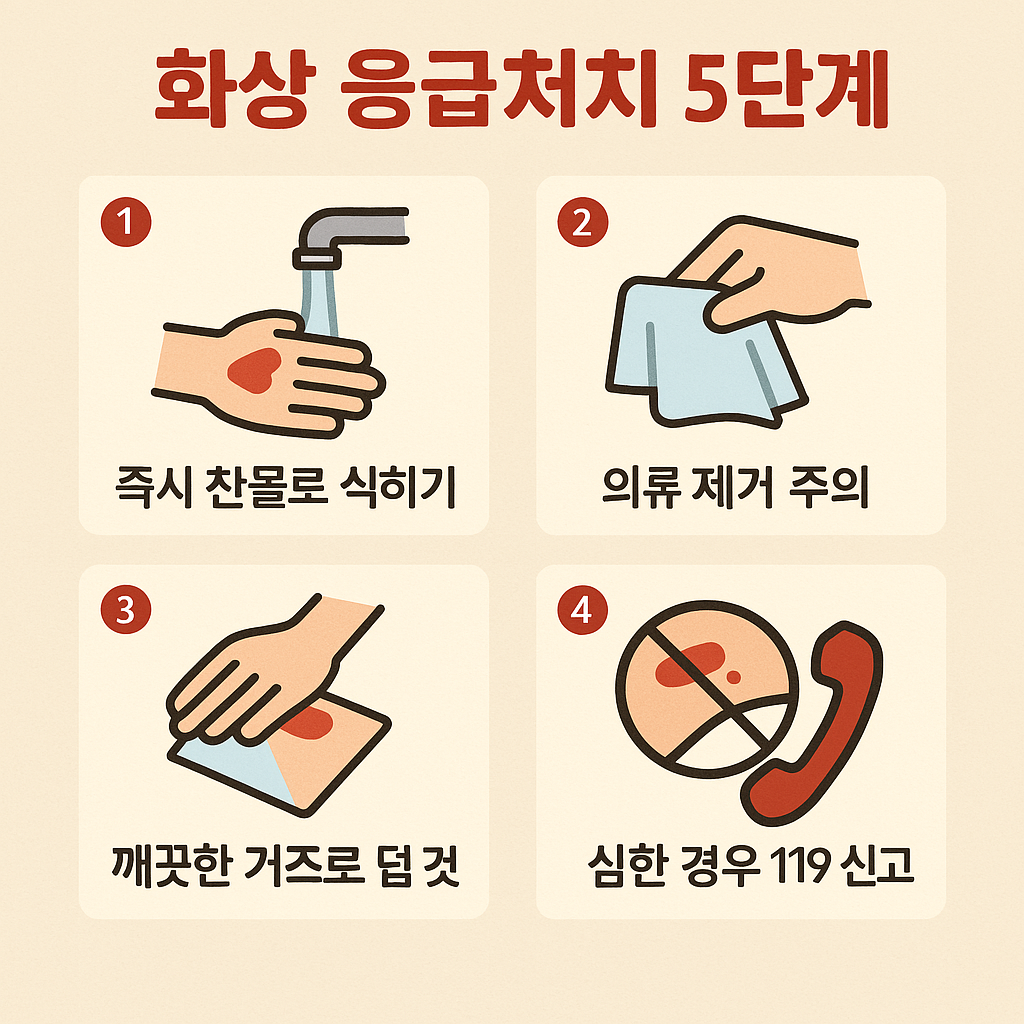 - 의류 제거 주의: 화상 부위에 붙은 옷은 억지로 떼지 말고 의료진에게 맡기세요.